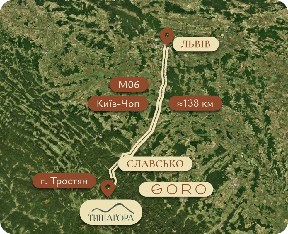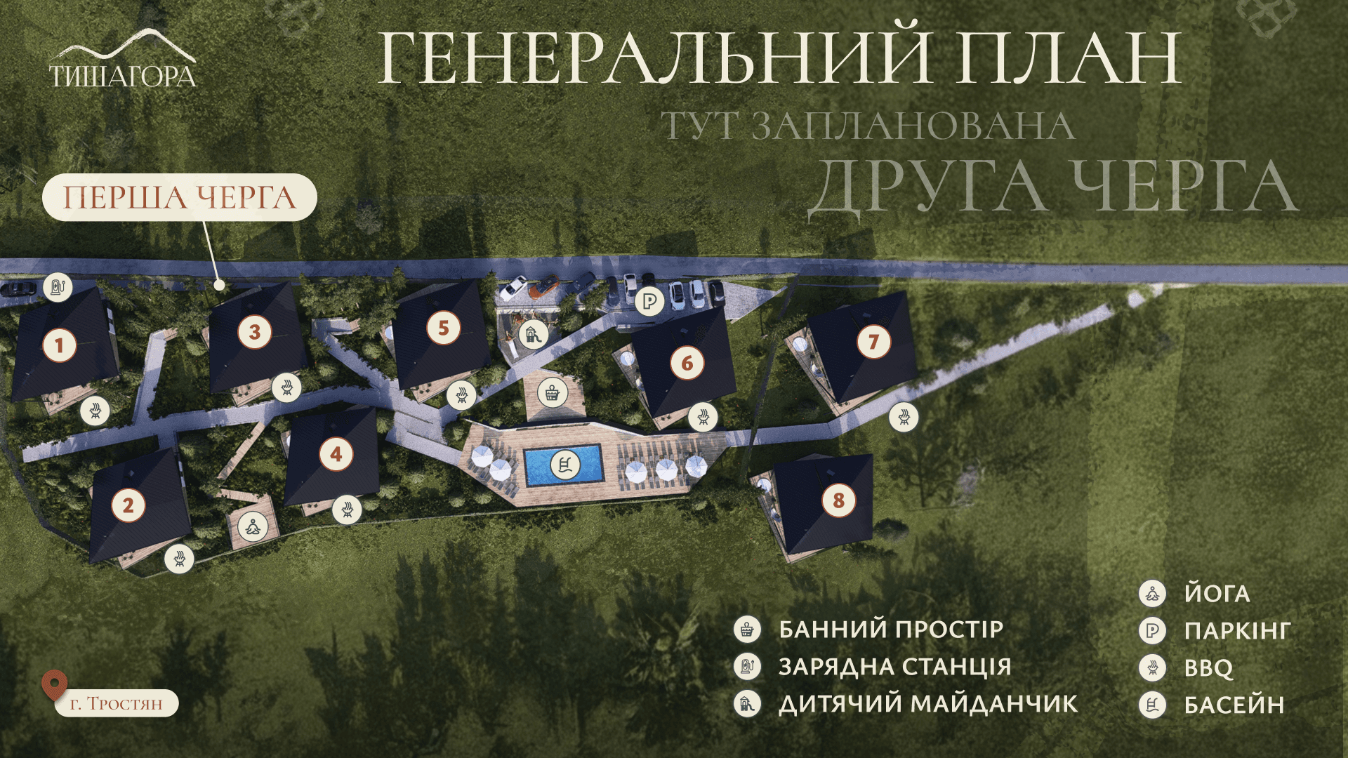 Тишагора — це комплексна концепція життя та інвестицій. Усі котеджі створені в єдиному архітектурному стилі, розташовані на схилі з краєвидом на гору Тростян і доповнені повноцінною інфраструктурою — банним простором, басейном й рекреаційною зоною. Ми будуємо не хаотичне містечко, а цілісний простір для спокою, природи та стабільного доходу.